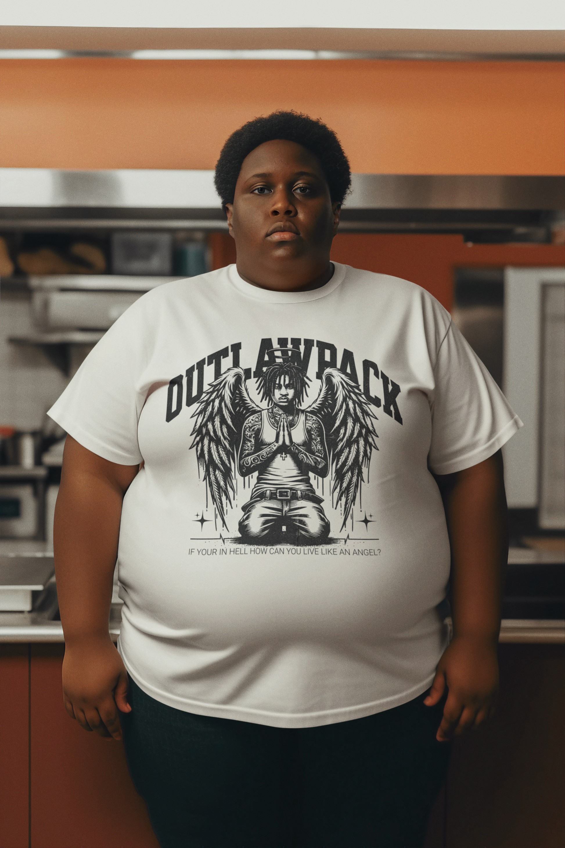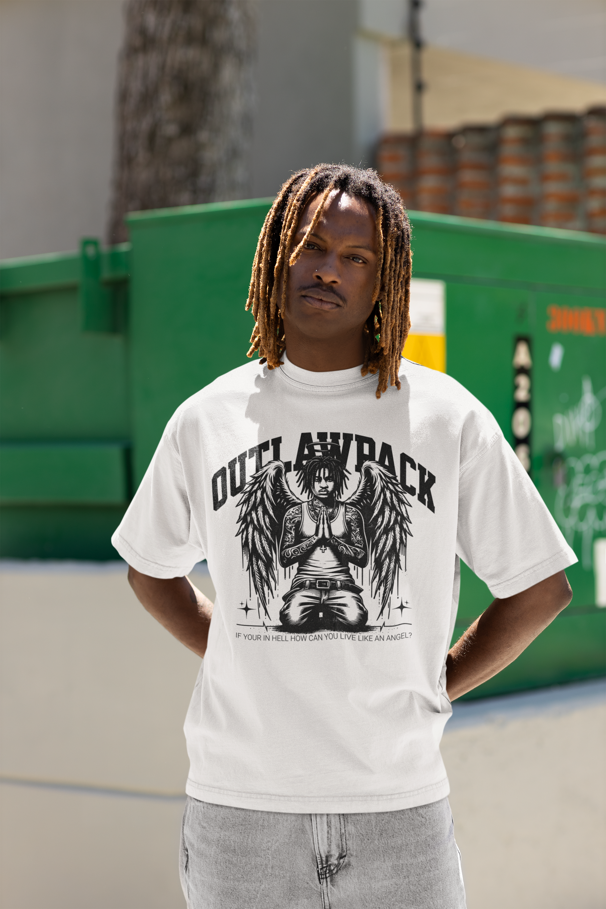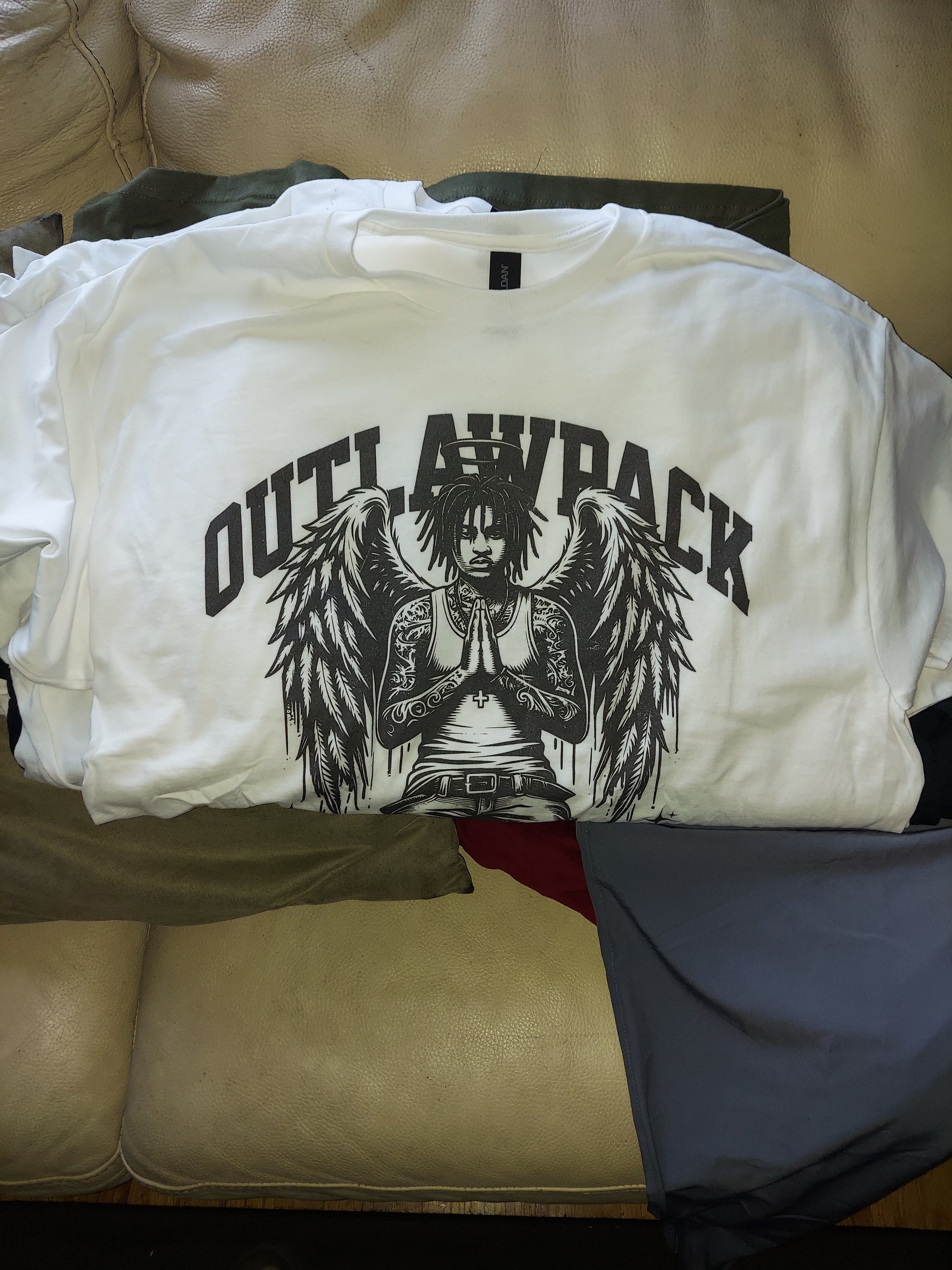 White t shirt. Cotton. Large Outlawpack Angel logo on front
