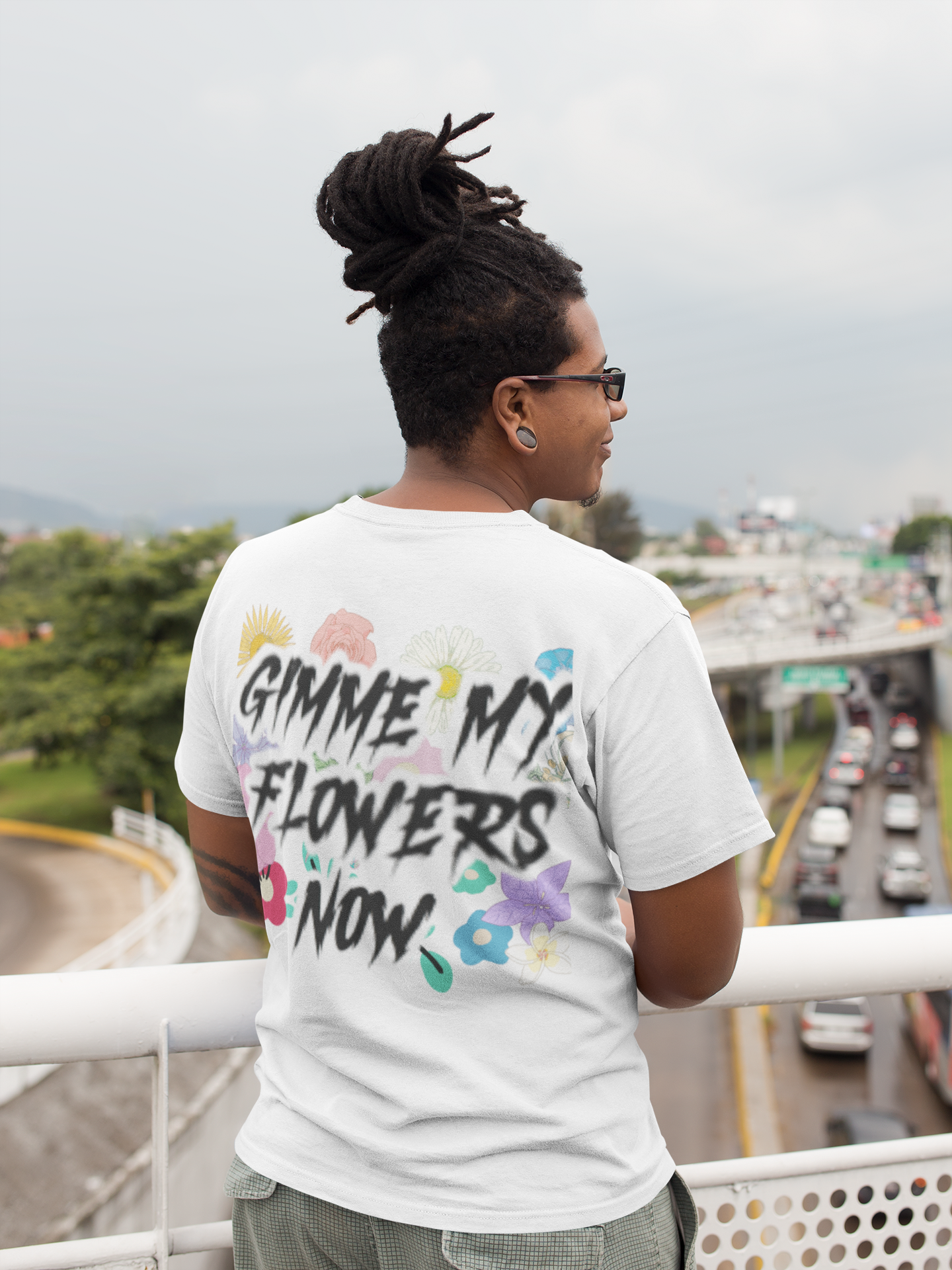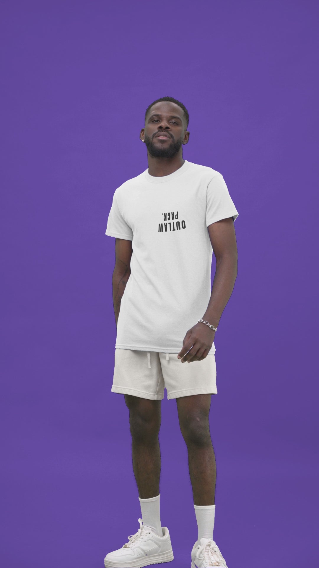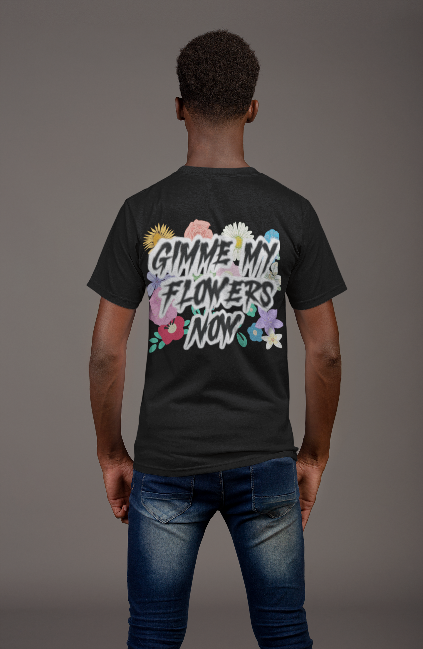 Cotton T with Outlawpack logo on front and flowers logo on back
