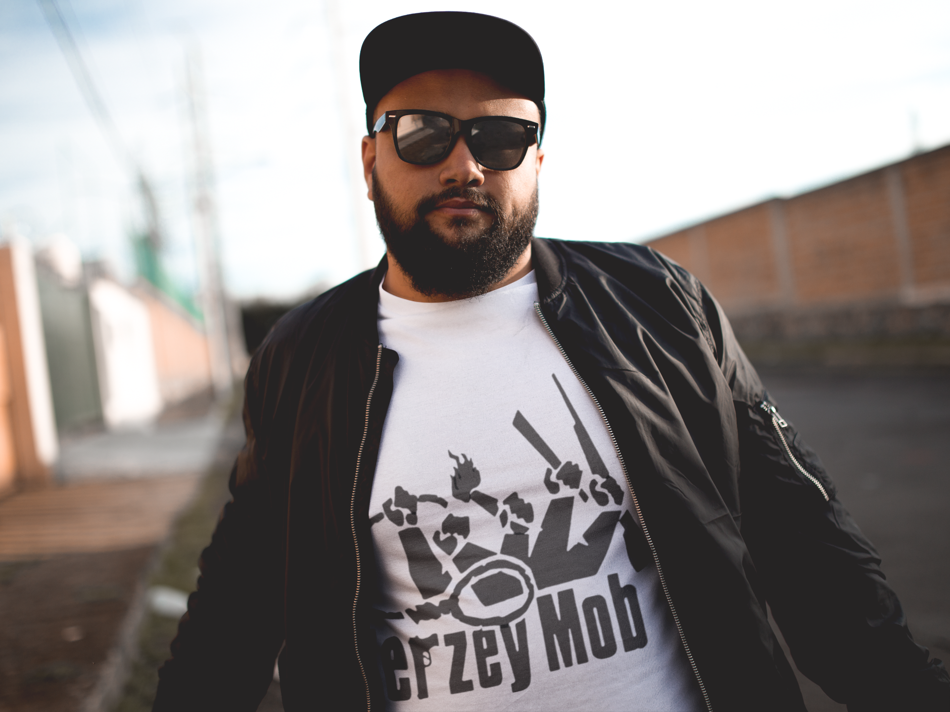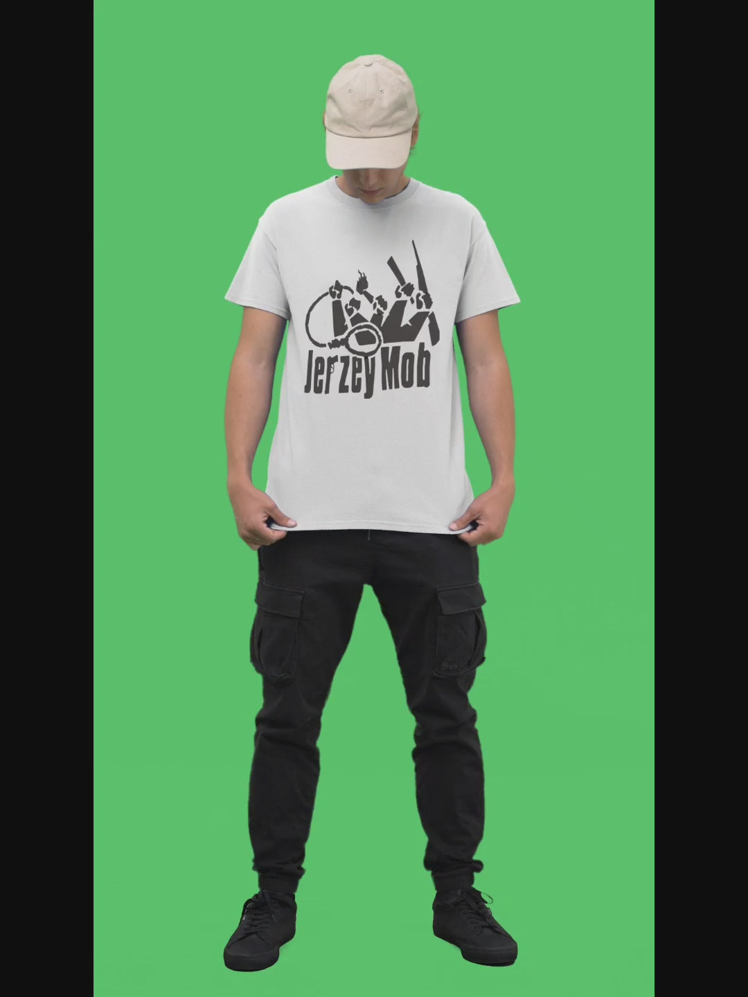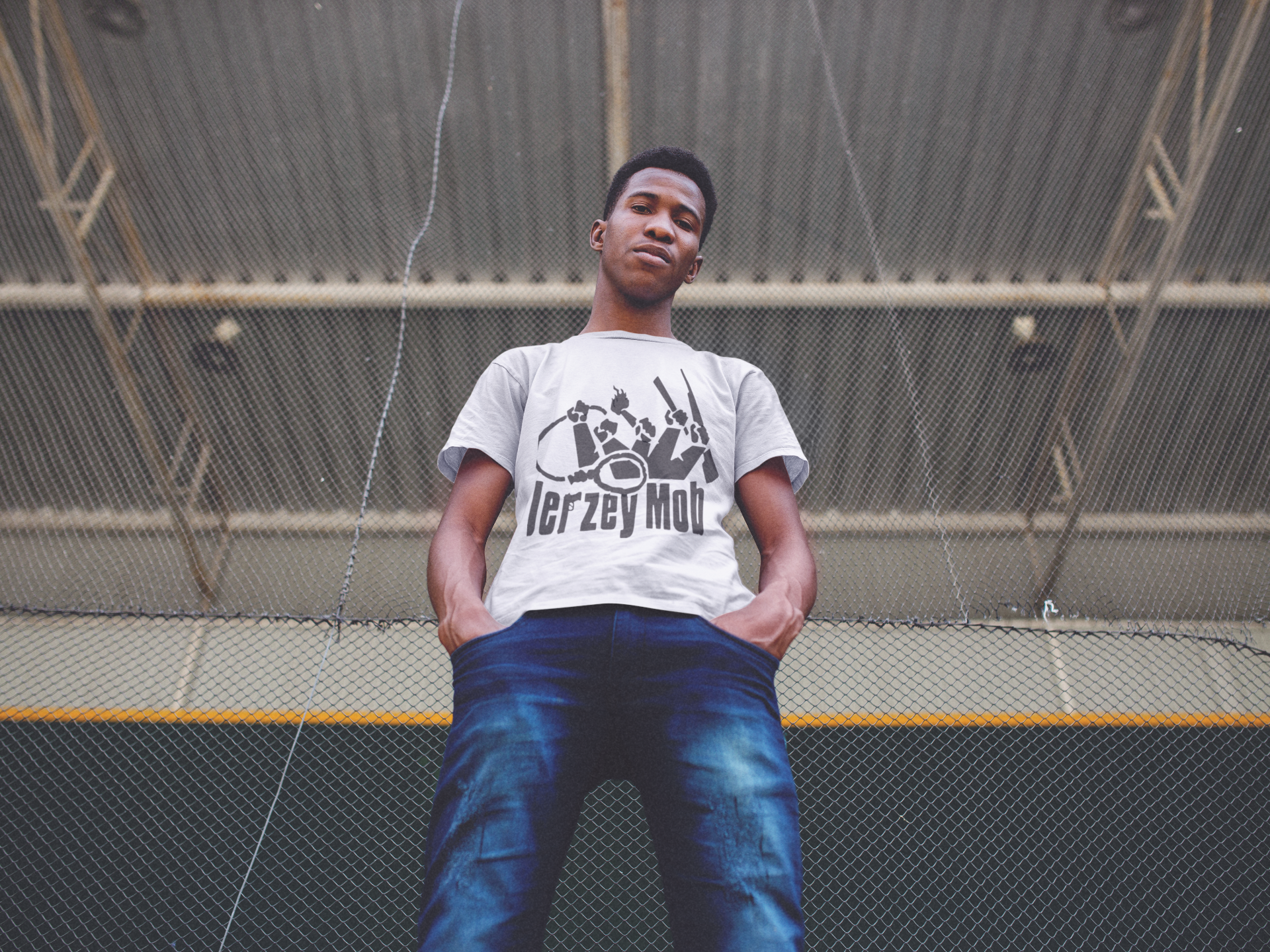 White cotton T shirt. Jerzeymob logo on the front. "Im from NEW" logo on the back